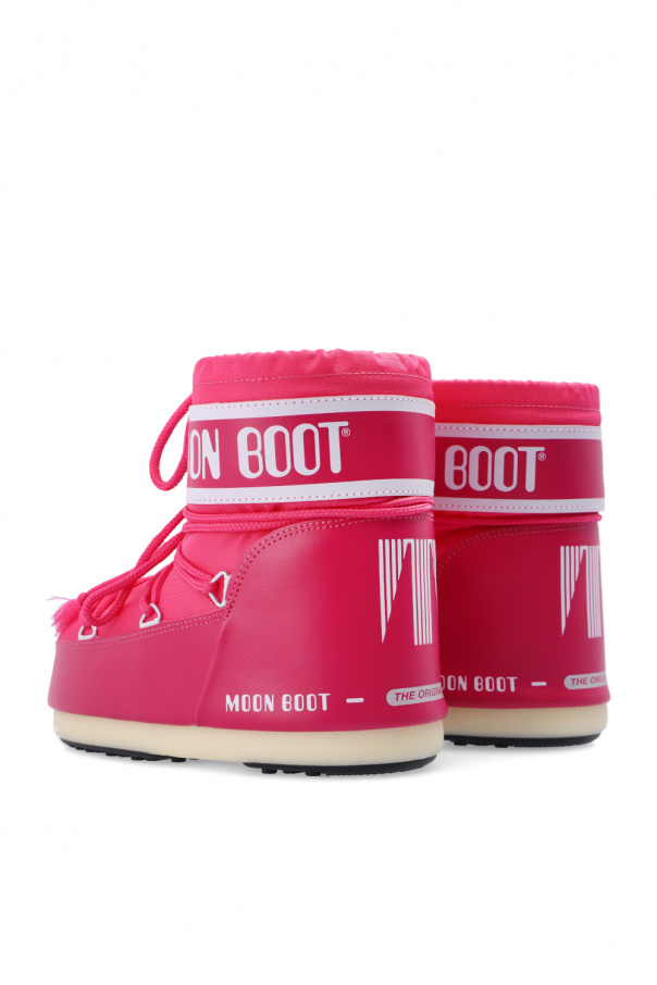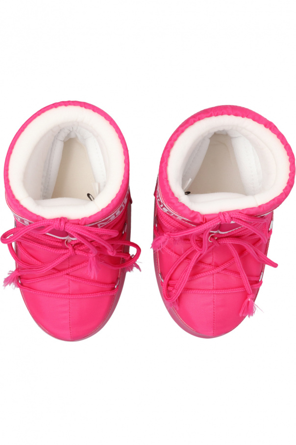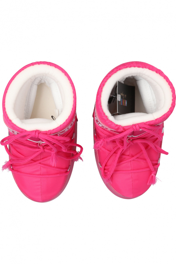 Pink and white ‘Classic Low 2’ snow boots from Moon Boot Kids. Trimmed with faux leather, this lace-up pair features a logo print, silver-tone metal hardware and rubber sole in cream and black. Inspired by the peculiar shape and technology of the astronauts’ boots, the iconic style was designed in 1969 after the first Moon landing.