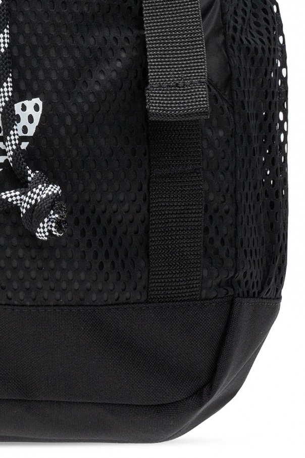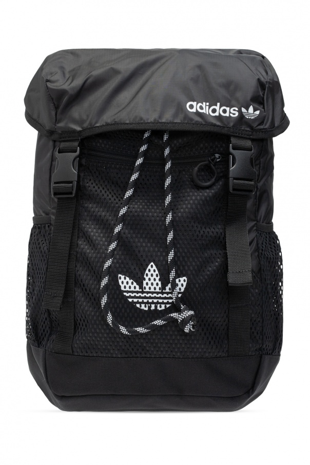 Black backpack from ADIDAS Originals. Printed with the brand's logo in white, this item features cinching drawstrings, snap closures, one zip pocket on the front, two slip pockets on the sides, a half-round top handle, adjustable shoulder straps and interior with one compartment and three pockets.
