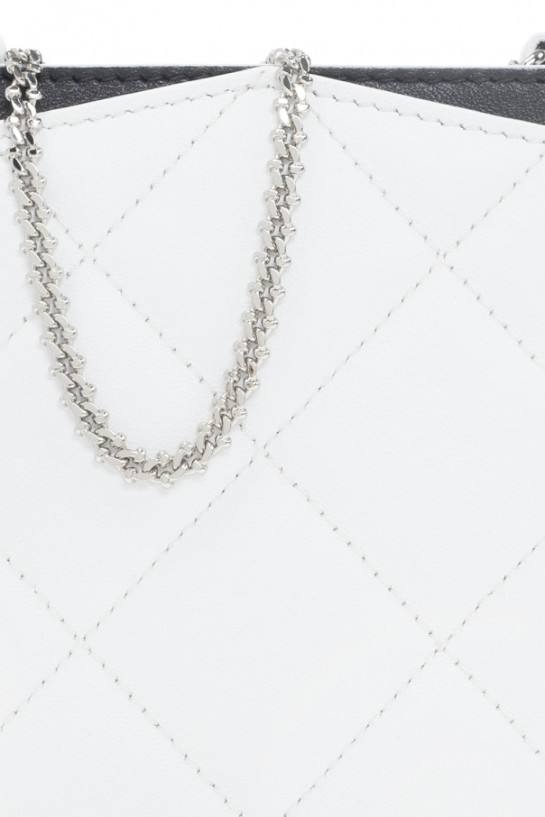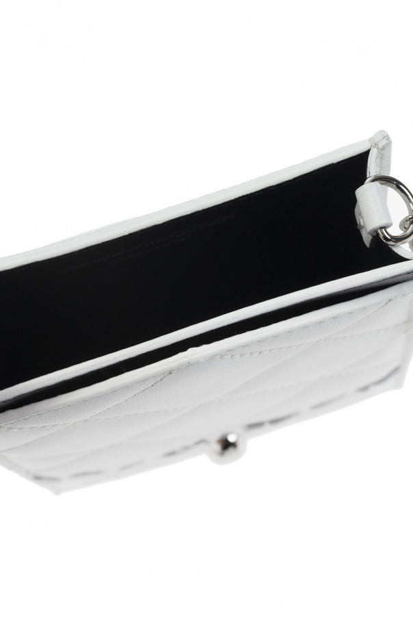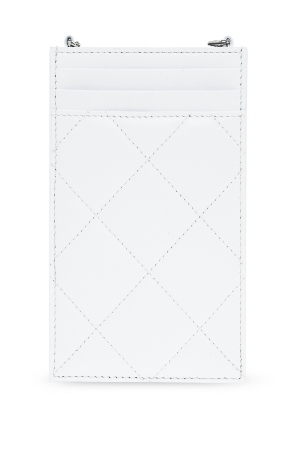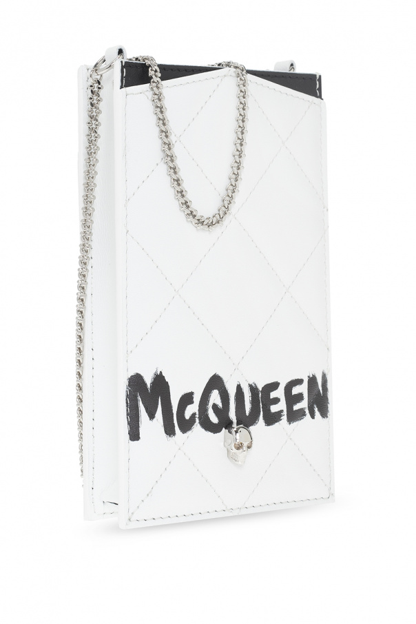 White quilted smartphone holder from Alexander McQueen. Made of lamb leather, this item features the brand's signature skull appliqué and black logo detailing on the front, a chain strap, silver-tone metal hardware and one internal compartment with four card slots.