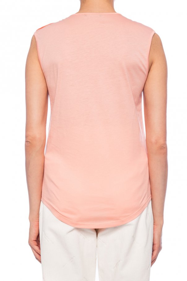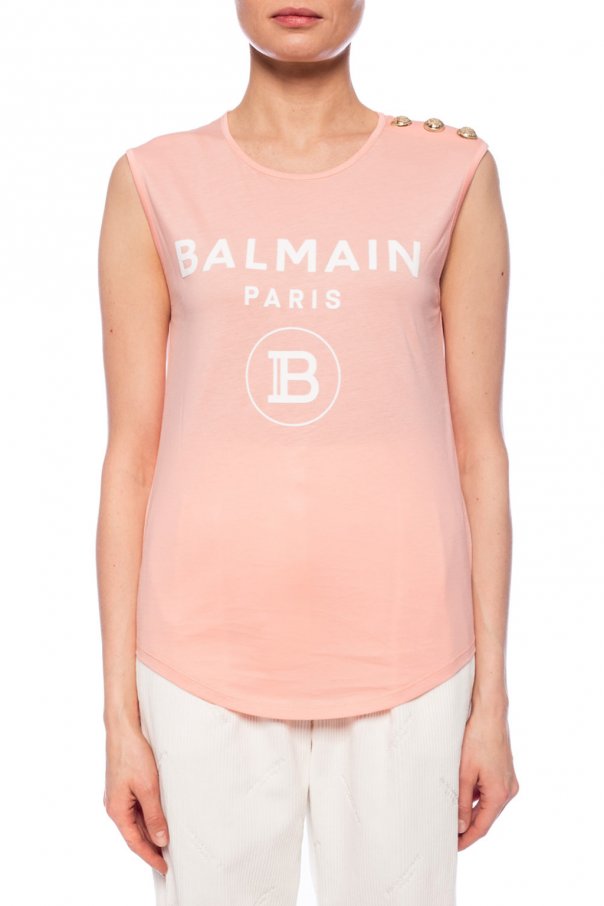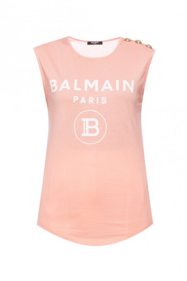 Pink sleeveless top from Balmain. Made of cotton. Decorated with a white logo print. 3 decorative buttons on one shoulder. Round neck.