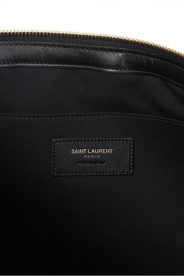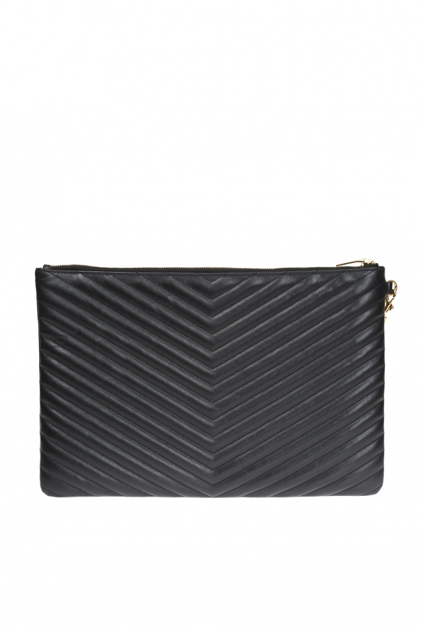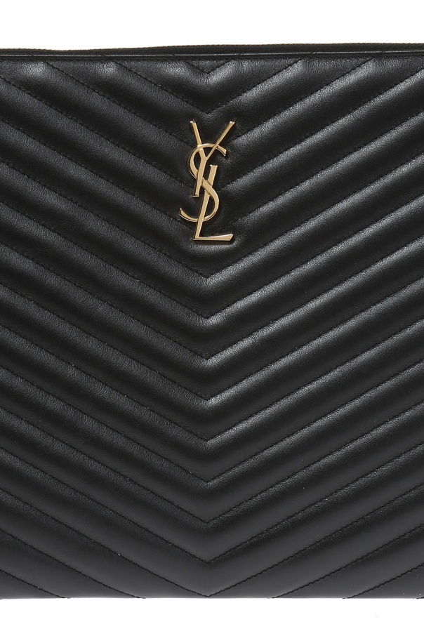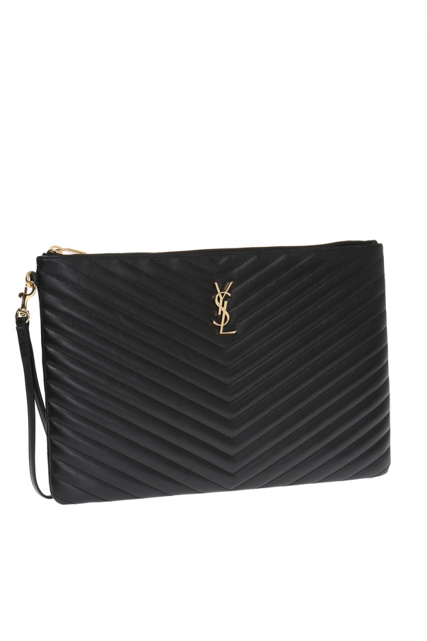 Black 'Monogram' quilted clutch from Saint Laurent. Made of calf leather. Zip fastening. Metal logo on the front. 2 slip pockets and 6 card slots inside. Detachable leather wrist strap. Gold-tone metal hardware.