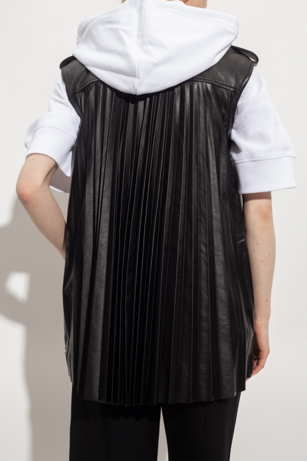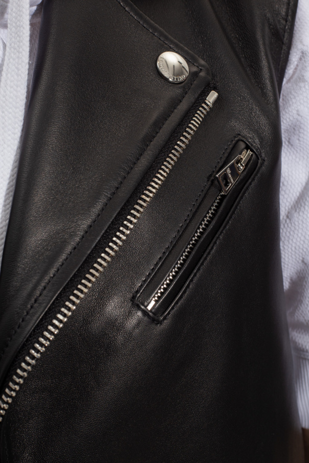 Black vest from Red Valentino. Made of lamb leather, this style features a zip fastening, a buckle belt, shoulder epaulettes, three zip pockets and one snap-fastened flapped pocket on the front, a pleated back and silver-tone metal hardware.