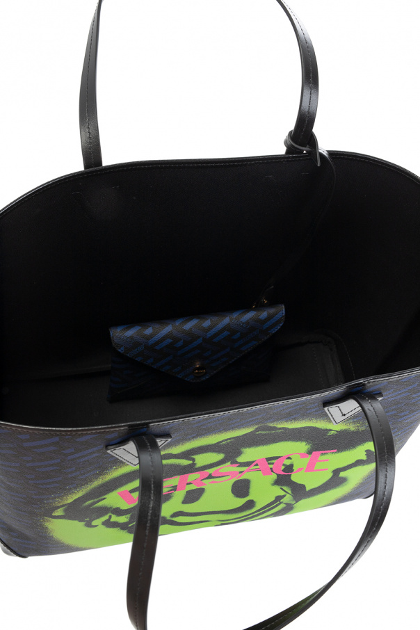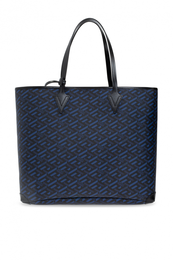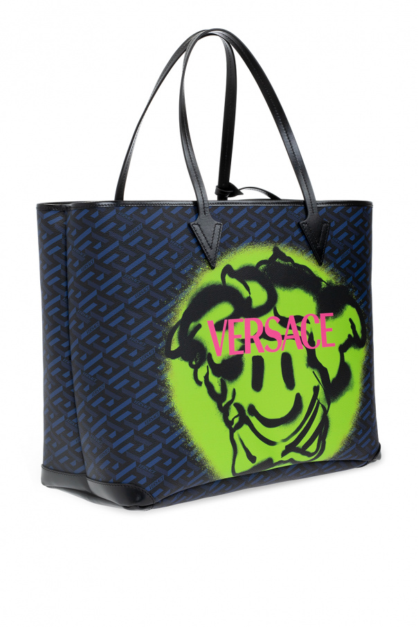 Black, navy and blue ‘Medusa Smiley’ shopper bag from Versace. Crafted from canvas with leather trims, this garment features the ‘La Greca’ pattern, ‘Medusa Smiley’ print, two half-round handles and one internal compartment with a detachable zipped pouch.
