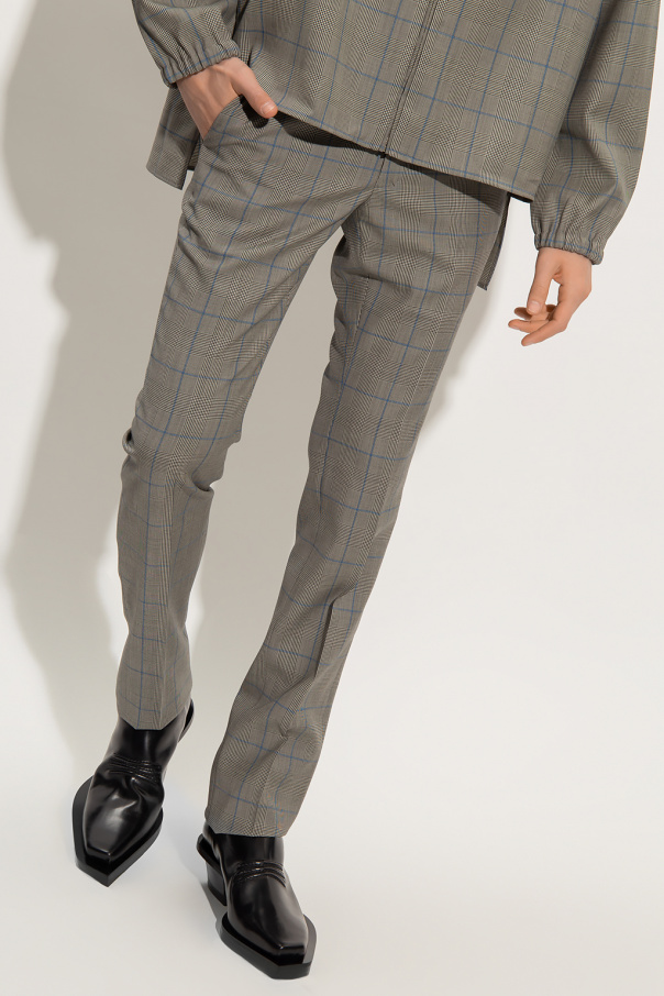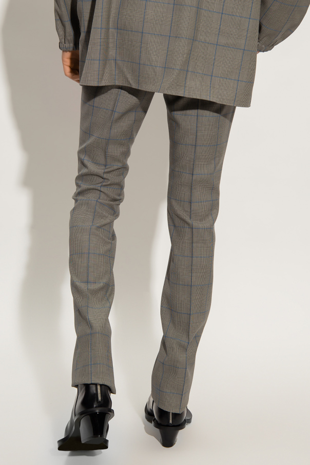 Grey trousers from Givenchy. Made of wool, this pair falls with slightly tapered legs and showcases a black and blue Prince of Wales check pattern. It is complete a zip fly with a button and hook as well as four slip pockets (two on the front and back) and two zip pockets on the front.