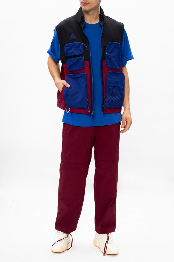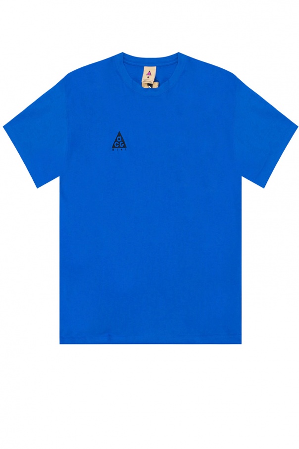 Blue crewneck T-shirt featuring black logo embroidery from Nike, ‘ACG’ collection. Made of cotton. This product was designed and tested in Oregon, USA. The state's vast wilderness and climate served as inspiration for the T-shirt's look and purpose. Nike ACG (All Conditions Gear) apparel is designed to provide convenient solutions for an unpredictable outdoor landscape.