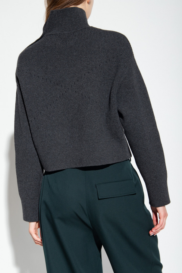 Dark grey sweater from Bottega Veneta. Crafted from a ribbed cashmere wool with embossed detailing, this style features a high-neck collar with side button closures and elasticized trims on the bottom hem and cuffs.