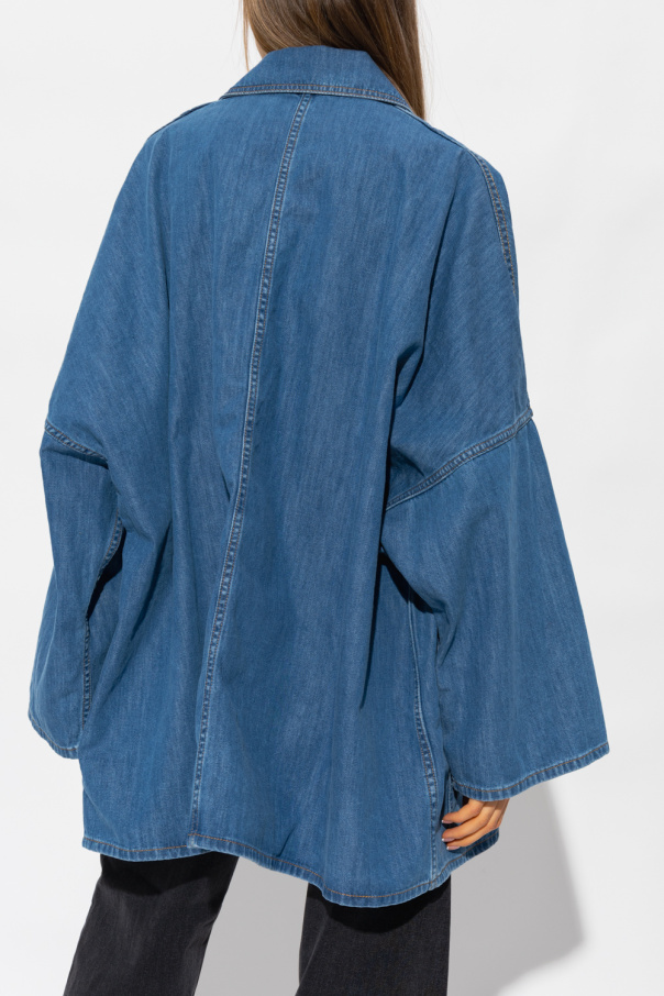 Blue denim jacket from Toteme. Crafted from organic cotton with an oversize fit, this style features snap fastenings, two flapped pocket and loose, three-quarter sleeves.