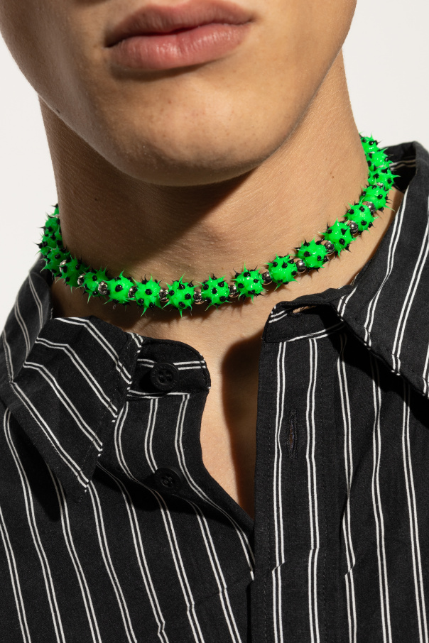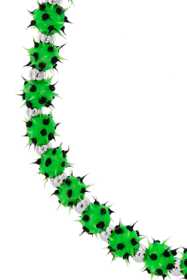 Discover the epitome of avant-garde elegance with the Logo Necklace from the exclusive Balenciaga collection. This exquisite choker, designed to sit closely around the neck, features a bold and distinctive design reminiscent of spiked spheres. Crafted meticulously from high-quality brass, plastic, and silicone, the necklace showcases vibrant green spiked beads adorned with subtle black accents, exuding a unique and edgy charm. The solid and secure metal clasp ensures both style and functionality. Presented in a striking green with silver and black highlights, this unisex piece is the perfect statement accessory for any sophisticated wardrobe. Why Choose This Product? Unique Design: The choker's spiked spherical elements make it a standout piece in any collection. High-Quality Materials: Crafted from durable brass, plastic, and silicone for lasting elegance. Secure Clasp: Features a reliable and stylish metal clasp for ease of wear. Versatile Style: Suitable for both men and women, adding a bold touch to diverse fashion ensembles. Exclusive Brand: Created by the renowned house of Balenciaga, known for merging couture craftsmanship with contemporary trends.