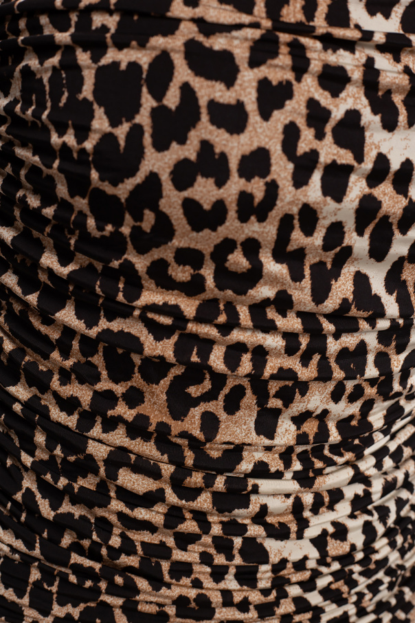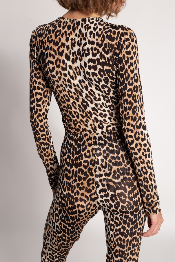 Beige and black ruched body from Ganni. Fastened with hooks, this long sleeve design features a leopard print and square neck.