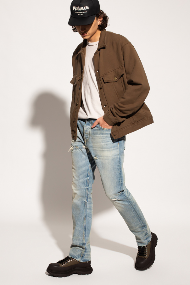 Blue distressed jeans from Fear Of God. Fastened with buttons, this pair falls down with straight legs and is complete with yellow stitching details, a black sewn-on appliqué, three front pockets, two back pockets and a raw edge.