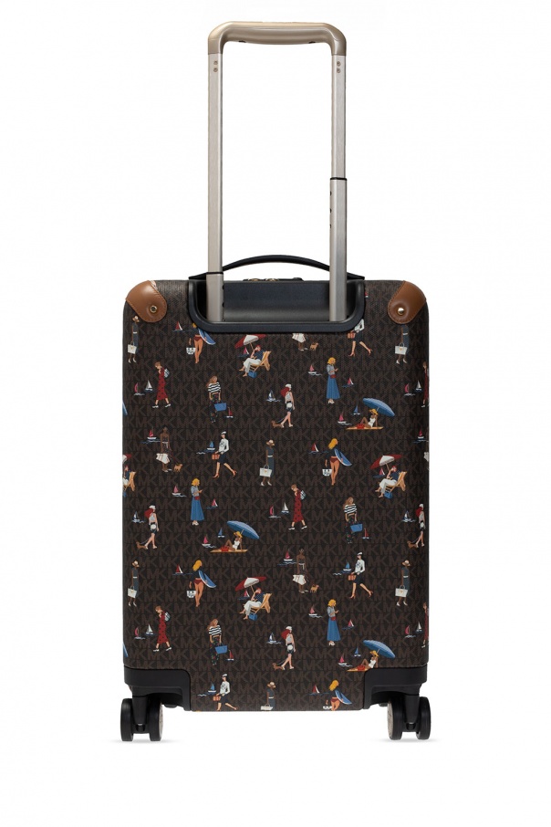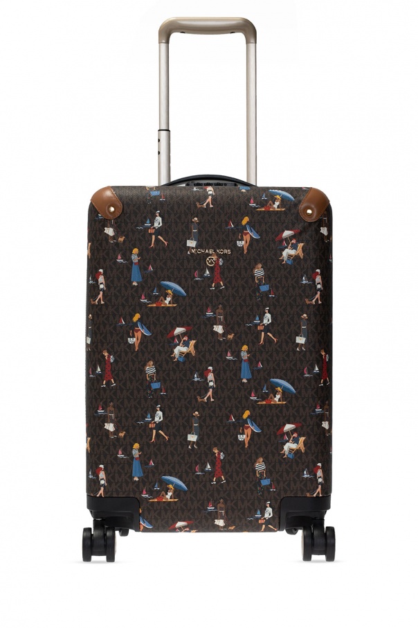 Brown suitcase from Michael Michael Kors. Crafted from canvas with leather trims, this design features a two-way zip fastening, a combination lock, a colourful graphic print, a gold-tone logo plaque on the front, two handles (incl. retractable one), 360-spinning wheels and two internal compartments with zipped pockets.