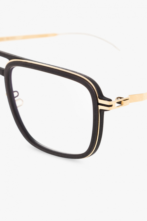 Black optical glasses from Mykita. Made of mylon – light and durable fabric with steel temples in gold-tone, this pair features patented spiral hinges, silicone tips and nose pads, double bridge and clear lenses with anti-reflective coating. Comes with a case. Handcrafted in Berlin.