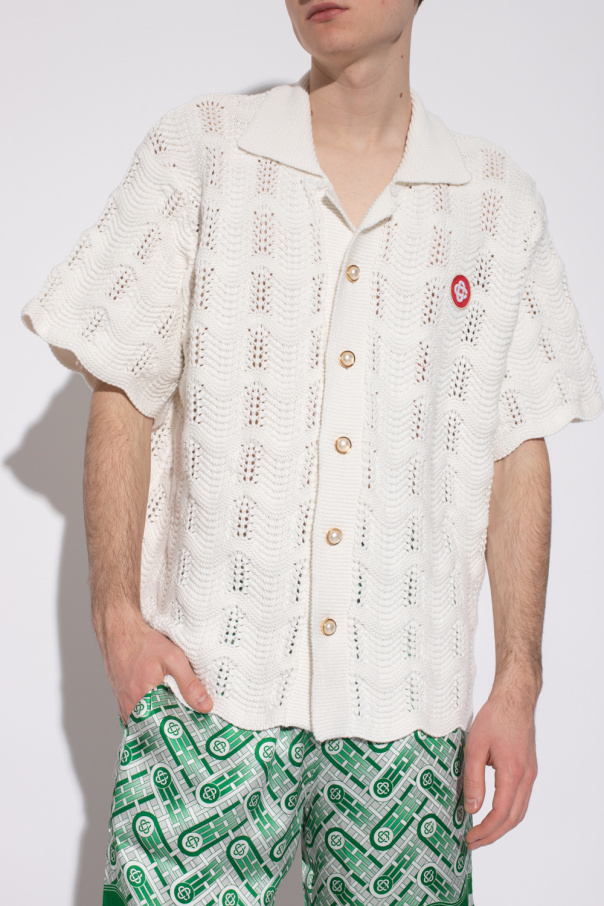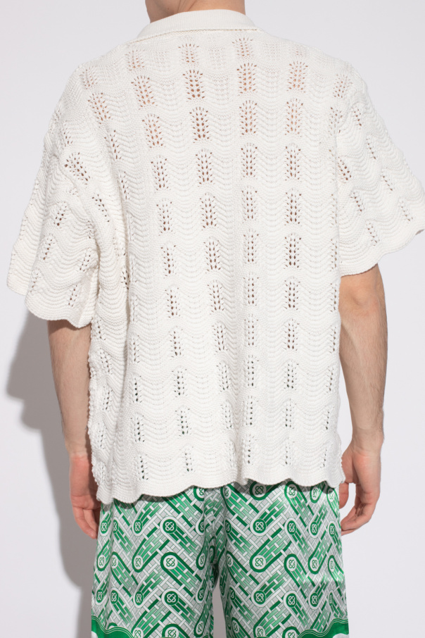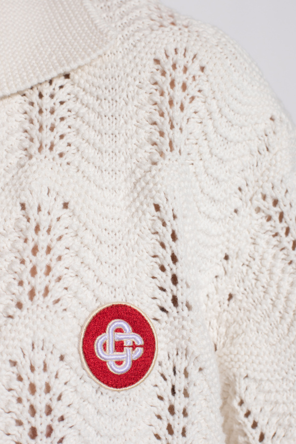 White cardigan with a collar from Casablanca. Made of cotton, this short sleeve design features decorative gold-tone buttons with faux pearls, decorative crochet pattern and patch with a Loopback logo in red and cream.