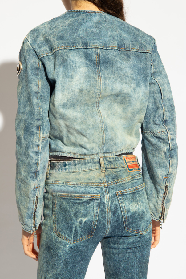 Navy blue ‘DE-CALUR-FSE’ denim jacket from Diesel. Enriched by a silver-tone metal logo plaque on the shoulder and distressed effects, this style features a two-way zip fastening, two slip pockets, long sleeves and zip detailing on the bottom hem and cuffs.