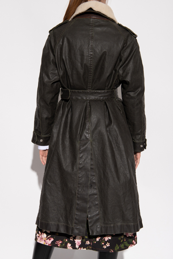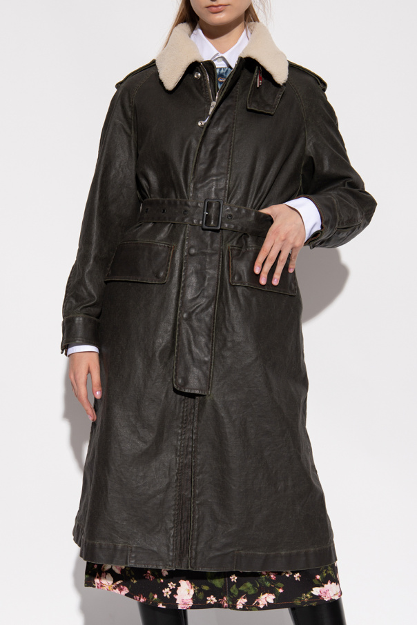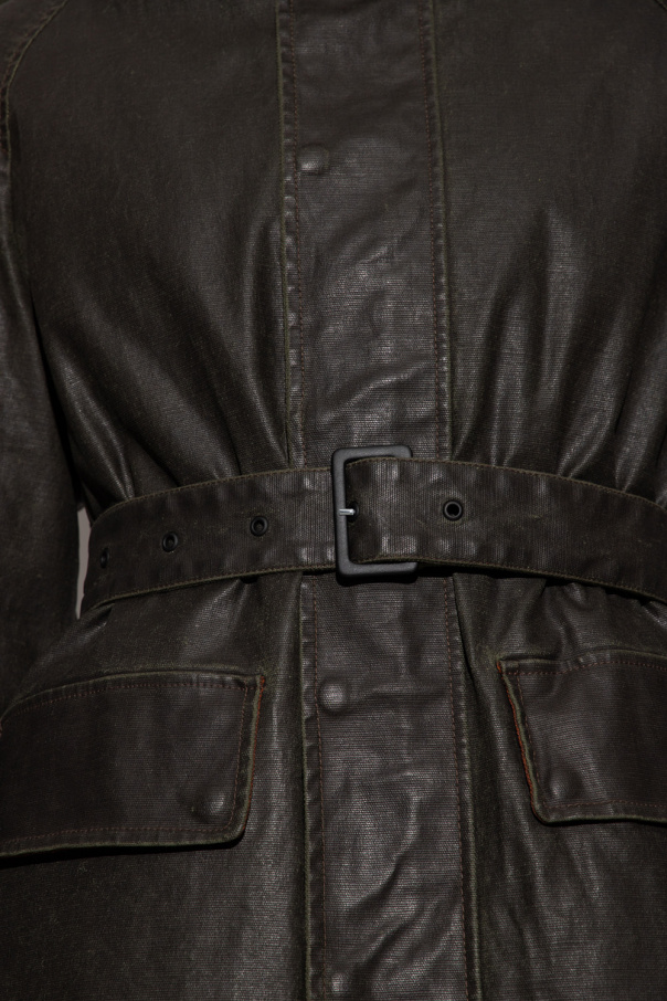 Dark green coat from Diesel. Crafted from wax-coated cotton canvas, this style fastens via a two-way zipper and snaps with a concealed placket and features a waist-cinching buckle belt, two flapped pockets on the front, a single back vent, silver-tone metal hardware, a detachable ram leather collar accentuated with a metal pin and a green quilted lining with denim accents and button fastenings.