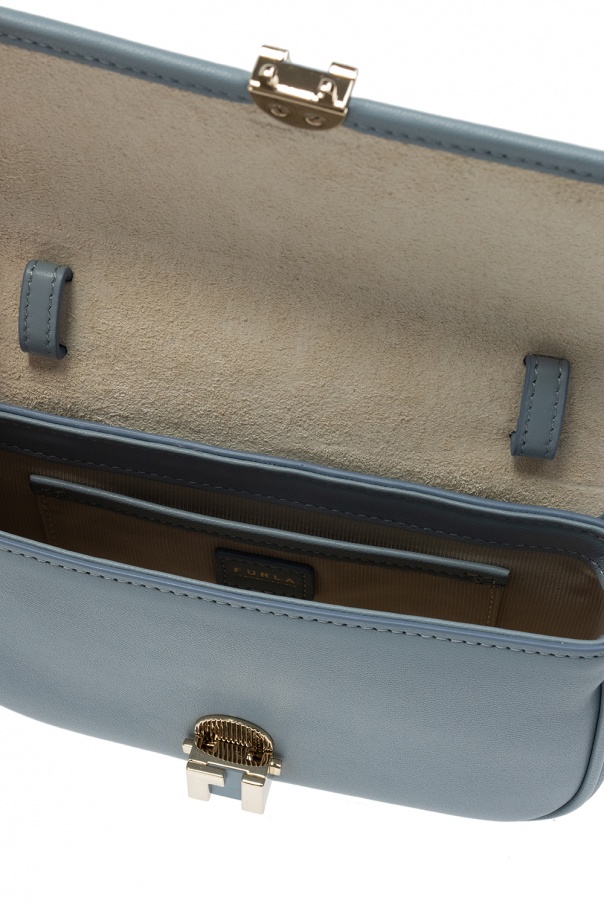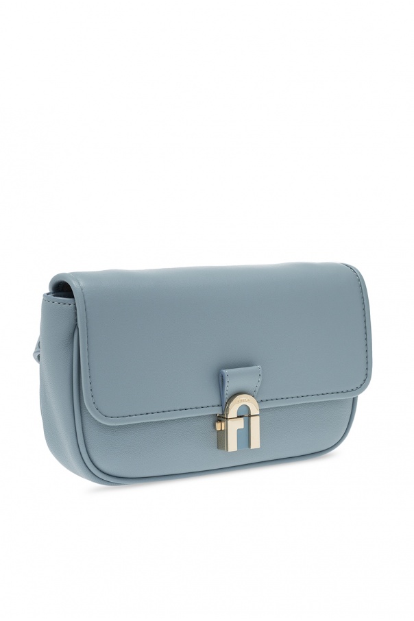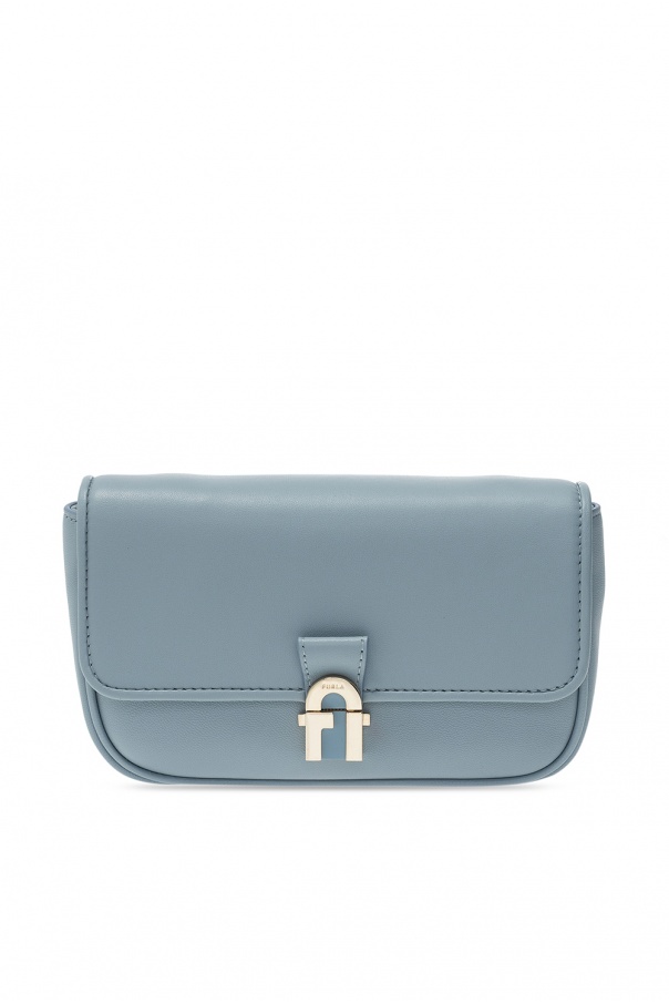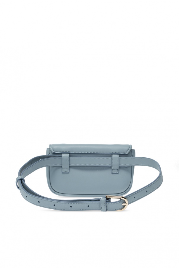 Blue ‘Cosy’ belt bag from Furla. Crafted from leather, this design features a decorative logo closure in gold-tone, beige suede lining and one internal compartment with a slip pocket and three card slots. This item can also be worn as a shoulder bag.