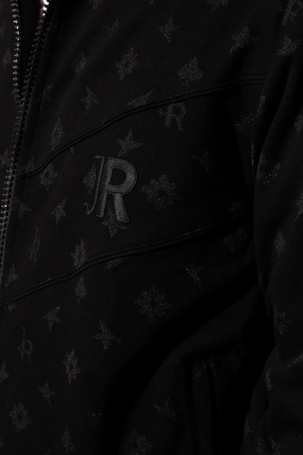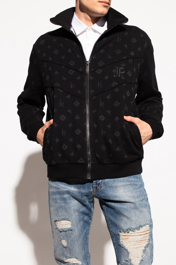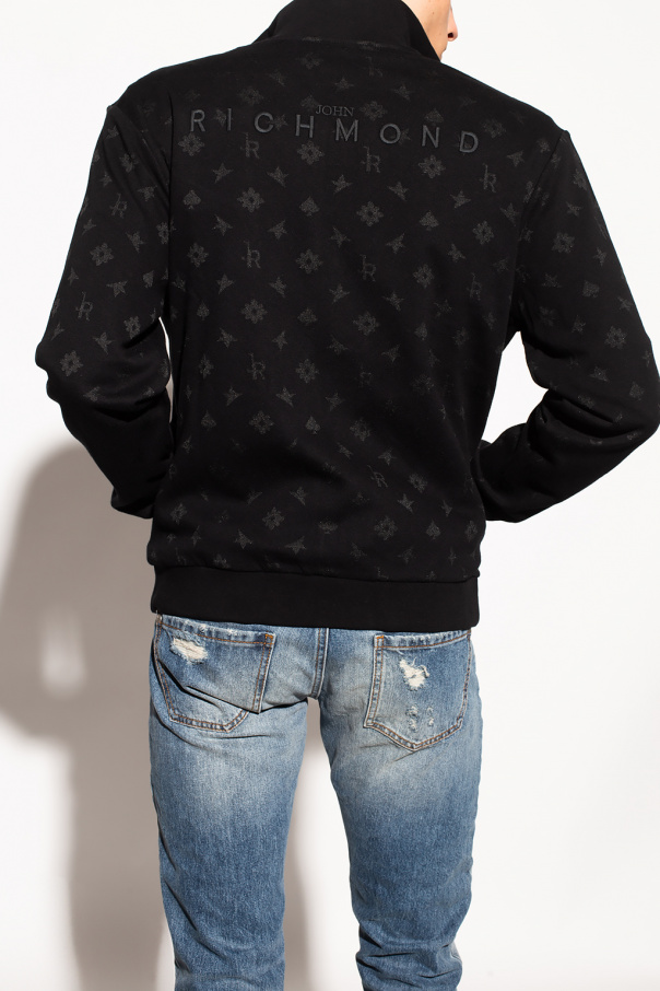 Black sweatshirt with a standing collar from John Richmond. Enriched by a logo pattern embroidered with grey and gold-tone lurex yarn, this style features a zip fastening, two zipped pockets on the front and long sleeves with elasticated cuffs.