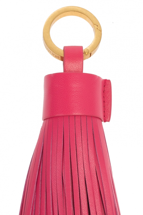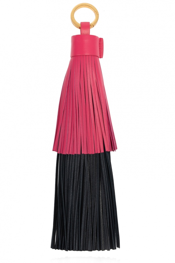 Pink and black keyring from Bottega Veneta. Crafted from lamb leather, this item features decorative tassels and a metal logo-embossed split ring in gold-tone.