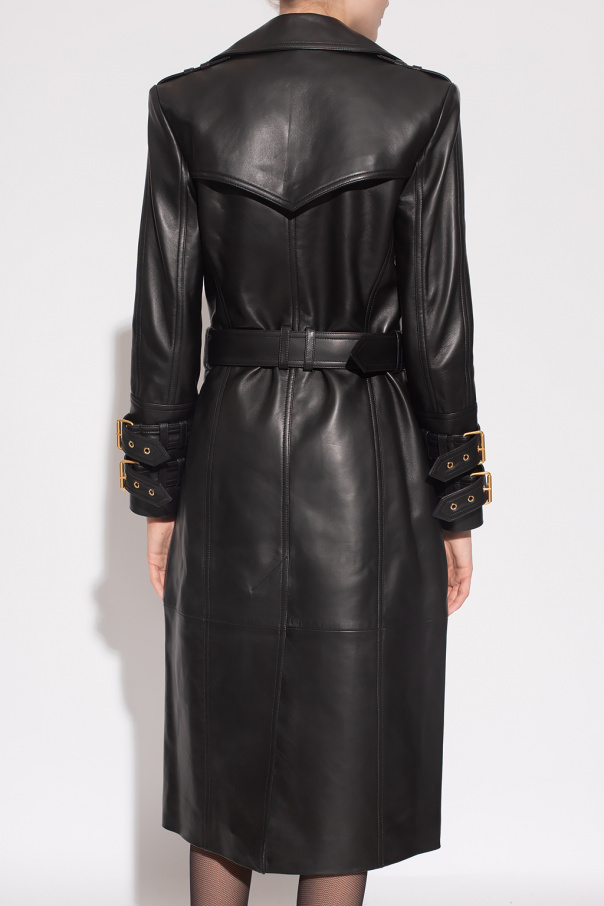 Black double-breasted coat from Balmain. Crafted from lamb leather, this garment features decorative buttons with a lion head detail, waist belt with a metal buckle, two front zip pockets, long sleeves with buckled straps and gold-tone metal hardware.
