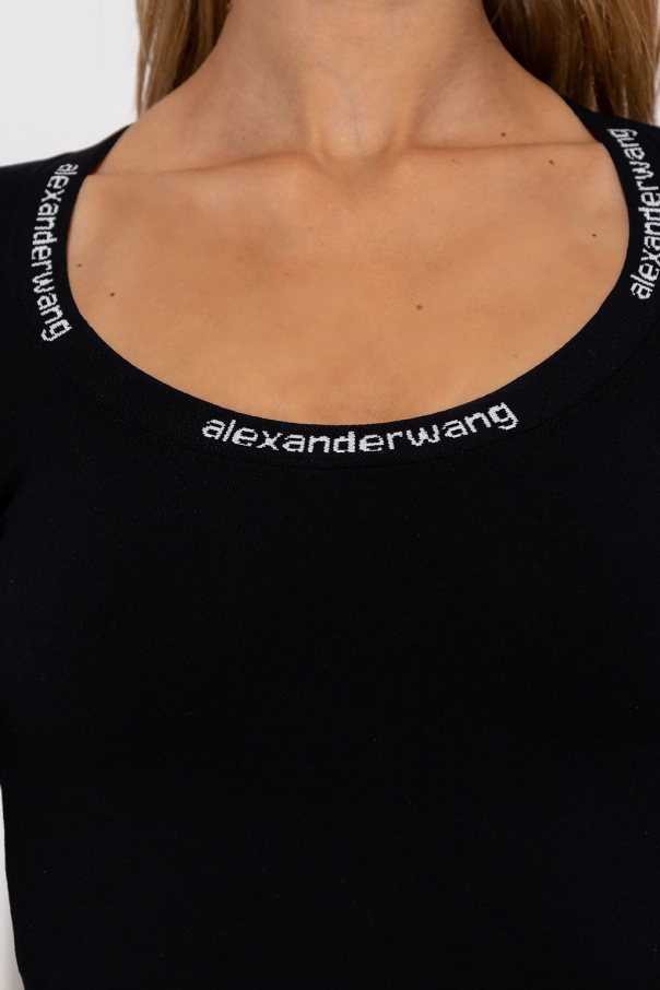 Black top from T by Alexander Wang. This garment is enriched by a crew neck embroidered with a white logo and ribbed trims.