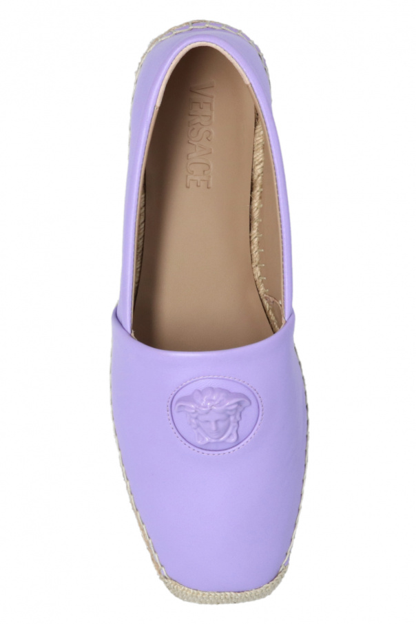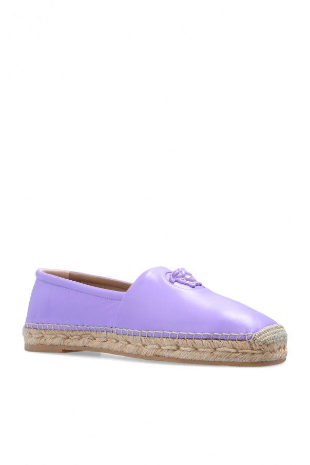 Purple ‘La Medusa’ espadrilles from Versace. Sitting on a brown rubber sole, this model showcases the brand's signature tactile Medusa application on the front.