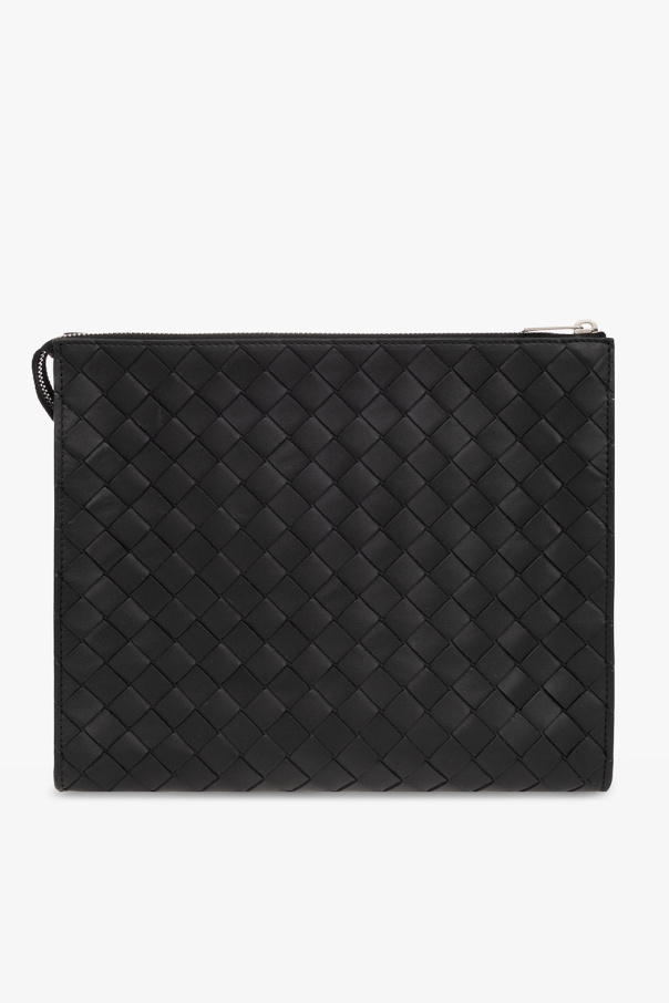 Black wash bag from Bottega Veneta. Crafted from calf leather with the brand's signature ‘Intrecciato’ weave, this design features a zip fastening, silver-tone metal elements and six card slots inside.