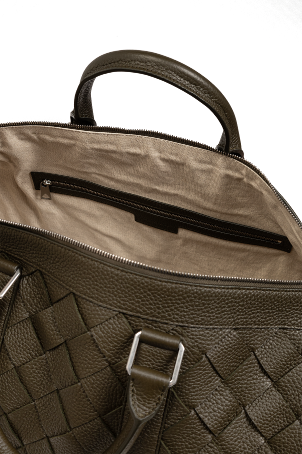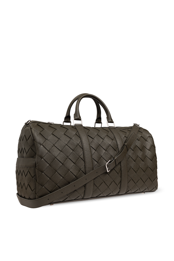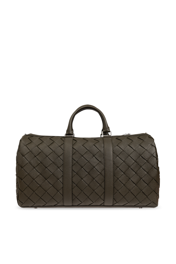 Introducing the Holdall Bag for men from the exclusive collection of the renowned designer Bottega Veneta. Crafted with unparalleled precision, this luxurious accessory is a testament to refined taste and superior craftsmanship. Constructed from high-quality calfskin leather, the bag boasts a distinctive woven pattern that exudes elegance and sophistication. The deep green hue imparts a modern and stylish appearance, while the classic rectangular shape with rounded edges ensures timeless appeal. Designed for both style and functionality, the bag features two leather handles for hand carry and a detachable, adjustable shoulder strap for versatility. The interior, lined with light-colored canvas, includes a spacious main compartment, a zipped pocket, and two slip pockets, offering ample storage and organization options. Silver-toned metal accents, including buckles and zippers, provide a striking contrast to the green leather, enhancing the overall aesthetic. Notably, the bag maintains a subtle elegance with no visible logos or inscriptions, focusing on the quality of craftsmanship. Why Buy This Product? Exquisite Materials: High-quality calfskin leather and durable canvas interior. Timeless Design: Classic shape with a modern deep green color. Functional Details: Dual carrying options, ample interior storage with multiple pockets. Elegant Finishes: Silver-toned hardware for added sophistication. Subtle Luxury: No visible logos, emphasizing superior craftsmanship.
