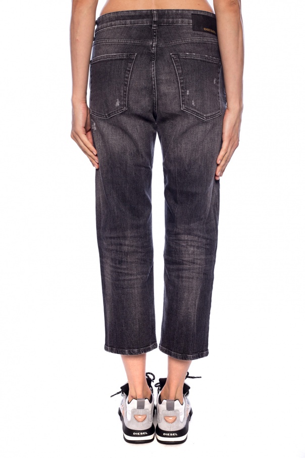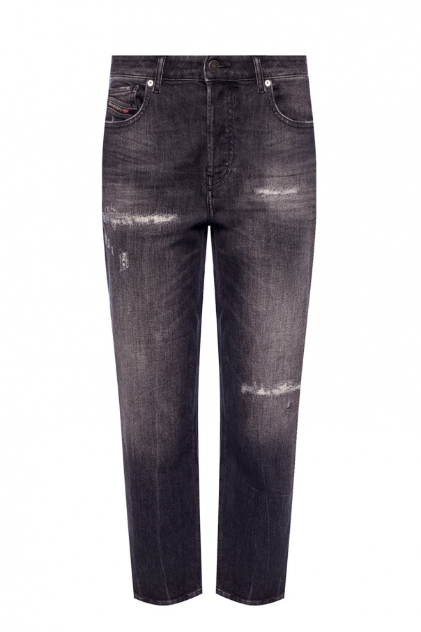 Grey ‘D-Aryel’ distressed jeans from Diesel. Fastened with buttons. Two slip pockets on the front, two at the back. Tapered legs.