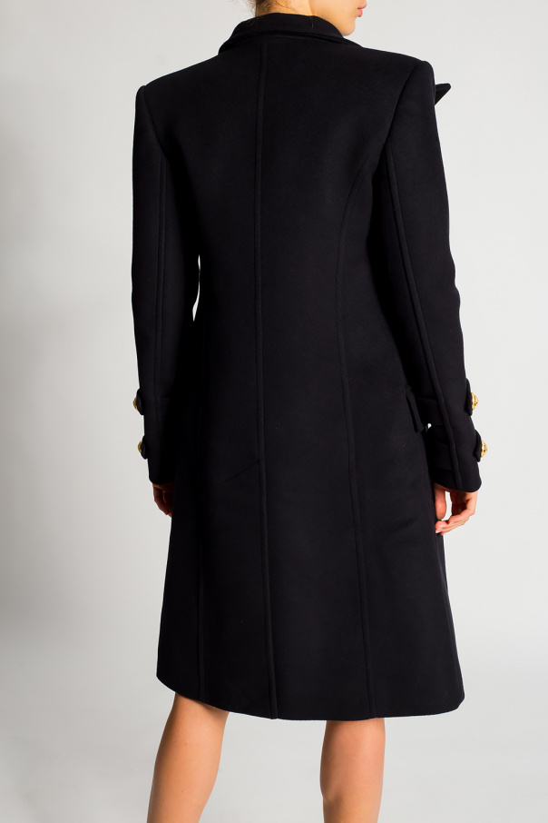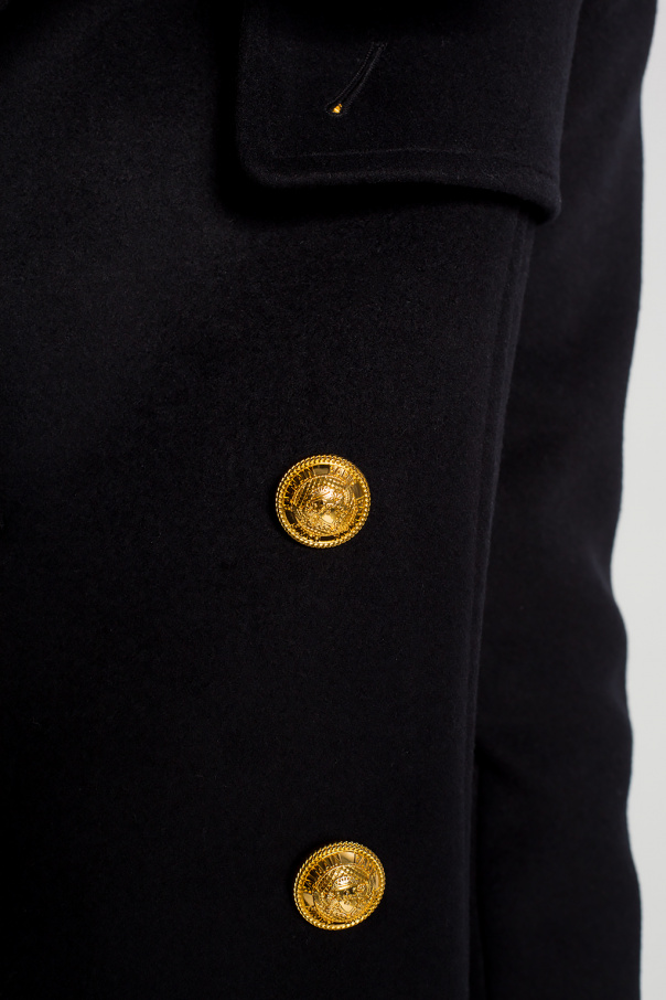 Black double-breasted coat with a standing collar from Balmain. Crafted from a wool and cashmere blend, this style features button fastenings, two flapped pockets on the front, a single vent at the back and long sleeves with double button straps.