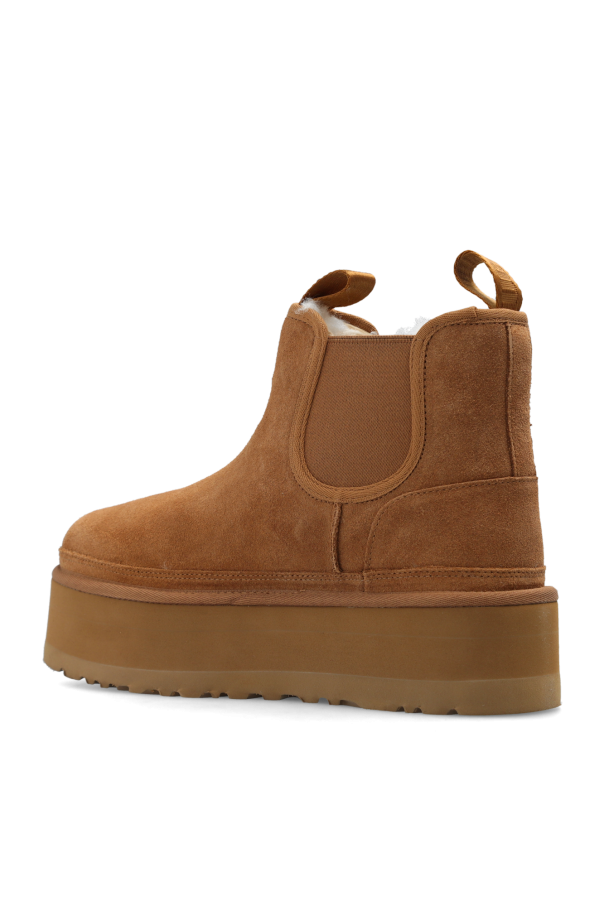 Beige ‘Neumel’ platform snow boots from UGG. Made of suede and lined with UGGPlush™, this model sits on a beige SugarSole™ made from plastic extracted from sugar cane and showcases an embossed logo and elastic panels on the sides.