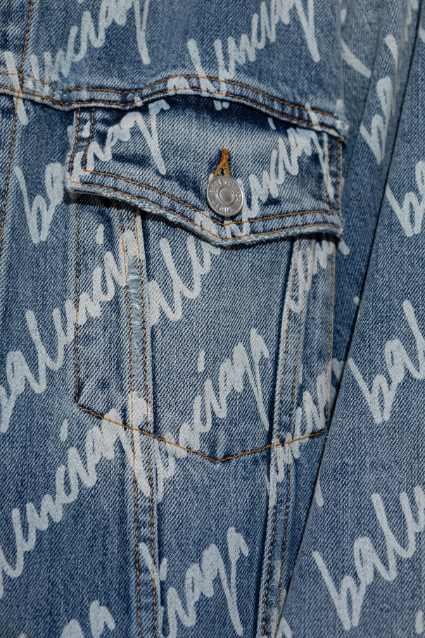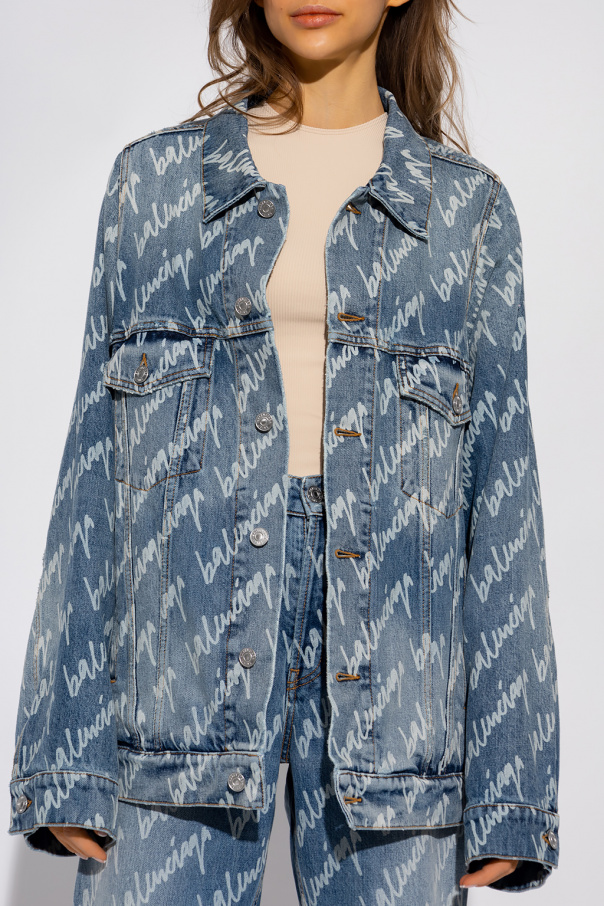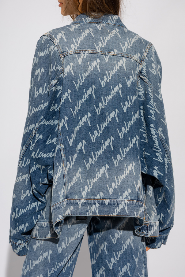 Blue denim jacket from Balenciaga. Fastened with buttons, this loose-fitting garment features a logo pattern, two flap pockets, two slip pockets, light brown logo patch and wide sleeves with button cuffs.