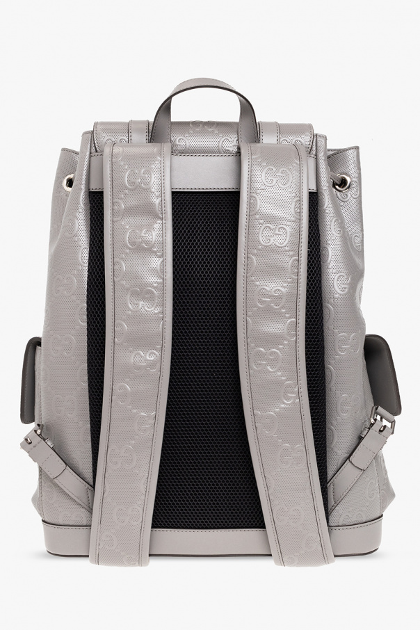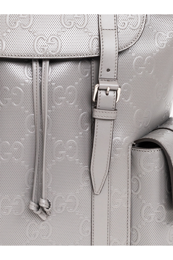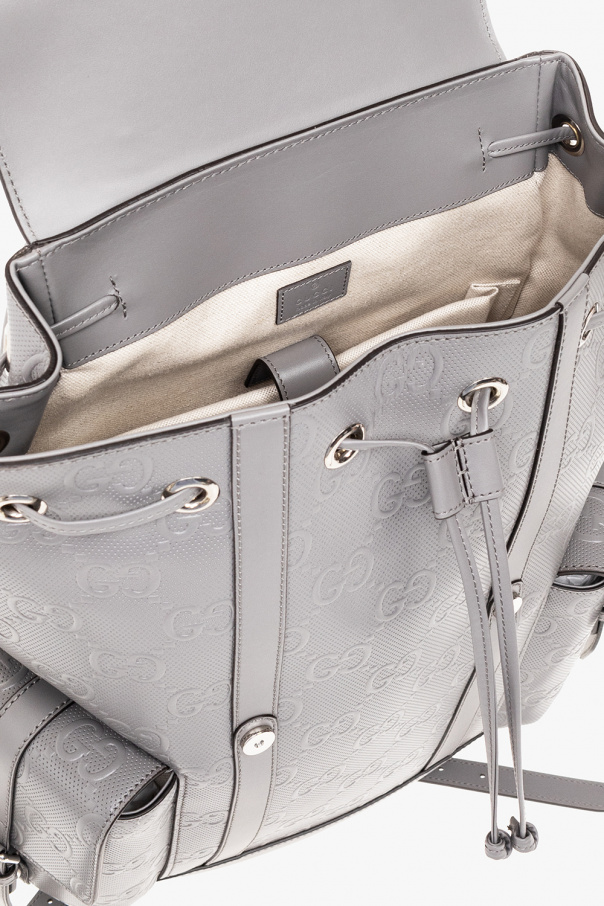 Grey backpack from Gucci. Made of cotton, this model features snap-fastened straps, side pockets with snap-fastened cuffs, top handle, adjustable shoulder straps, silver-tone metal hardware and one internal compartment with drawstrings and one velcro-fastened pocket.
