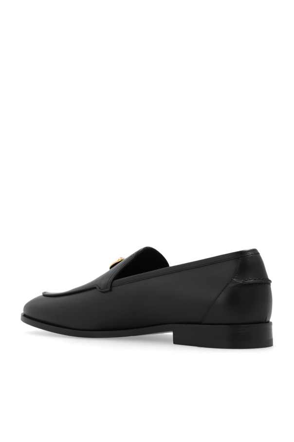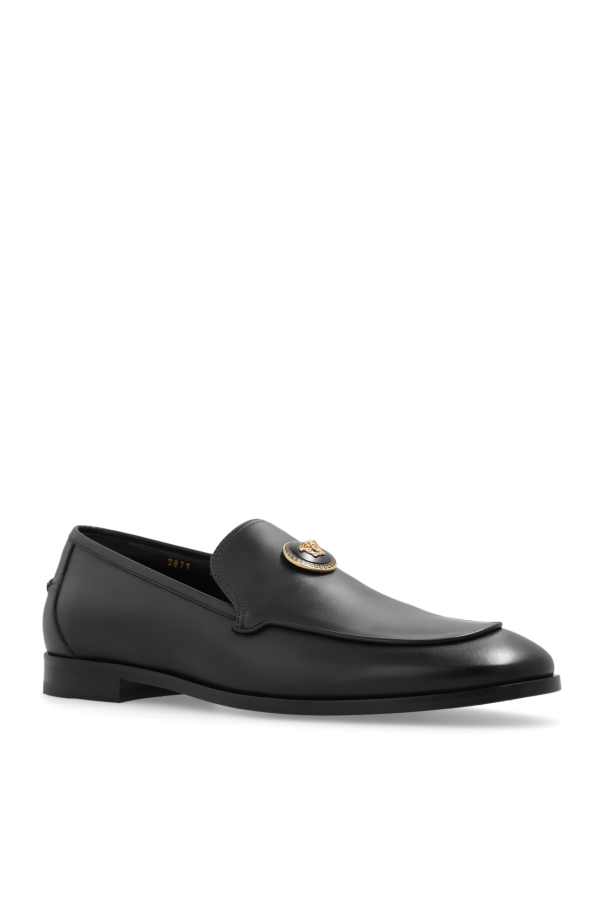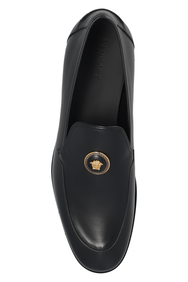 Black loafers from Versace. Made from smooth leather, this model sits on a black leather sole and showcases gold-tone and black hardware with the brand's signature Greca and Medusa face motifs.