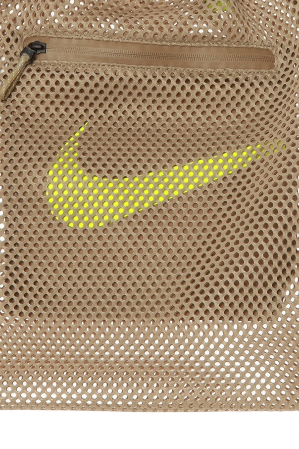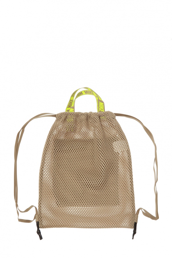Beige mesh gym sack from Nike. Featuring drawcord fastening, which doubles as shoulder straps, this design employs an external zipped pocket with printed neon yellow logo on the front, two logo-embroidered half-round handles in neon yellow and one internal compartment.