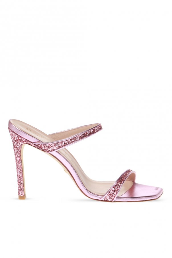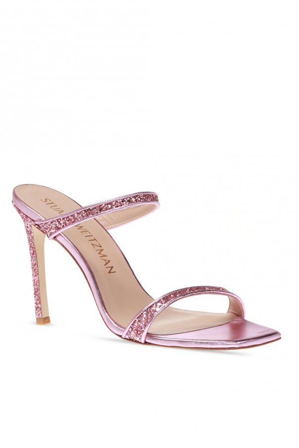 Pink heeled sandals from Stuart Weitzman. Crafted from shimmering leather, this design is complete with pink embellishments, square toe and beige leather sole.