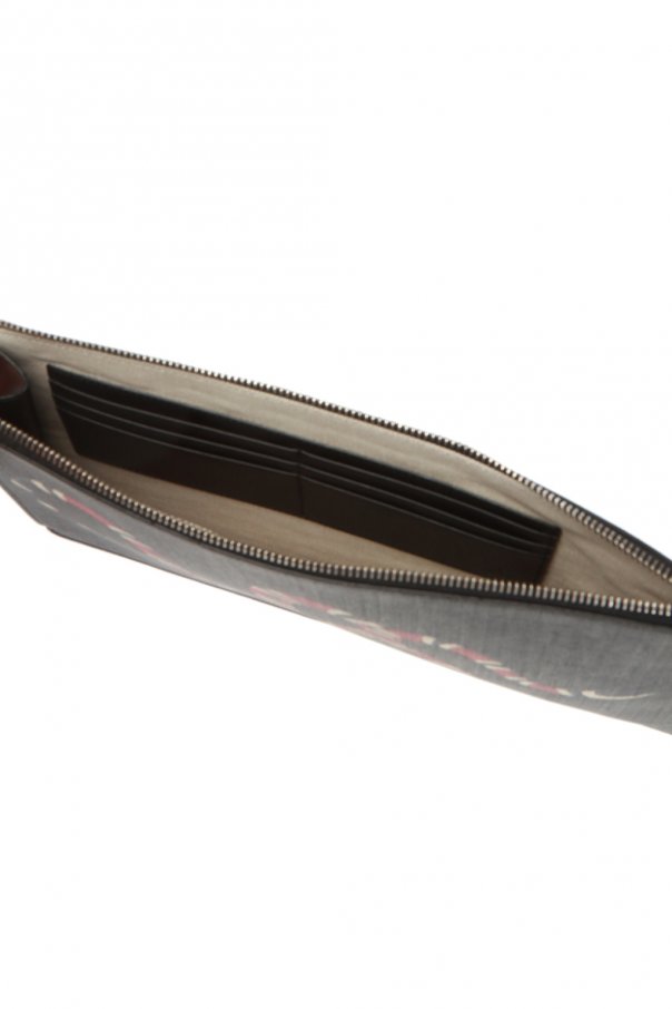 Black clutch from Gucci. Made of ‘GG Supreme’ canvas. Fastened with zip. Embellished with a colourful graphic print with motif of snake. It features removable wrist strap and interior with 1 compartment, 1 slip pocket and 6 card slots inside.