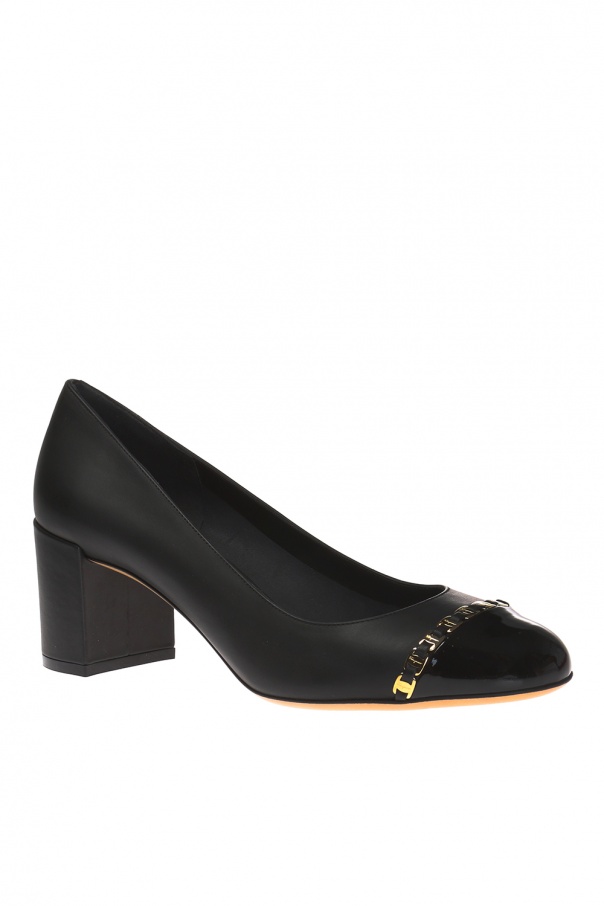 Black 'Avella' stack heel pumps from Salvatore Ferragamo featuring gold-tone chain application with logo-embossed inserts and brown leather sole.