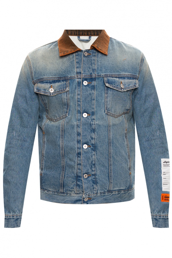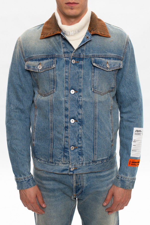 Blue denim jacket from Heron Preston. Designed with a contrasting orange collar, this trucker jacket was emblazoned with logo patches for the designer recognition and detailed with long sleeves, button closing and four pockets, including two with button-fastened flaps.