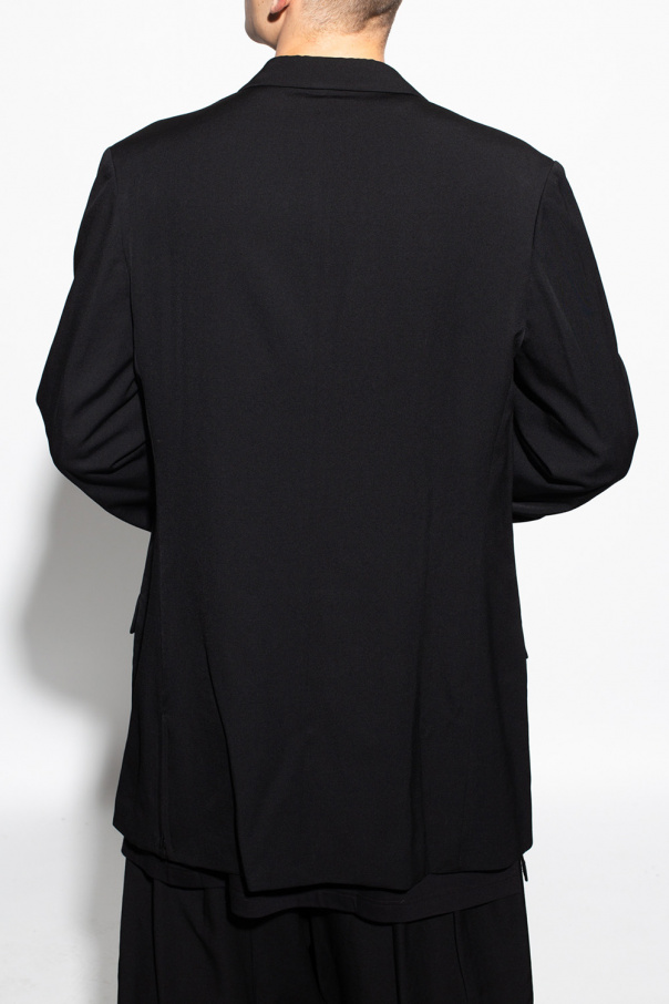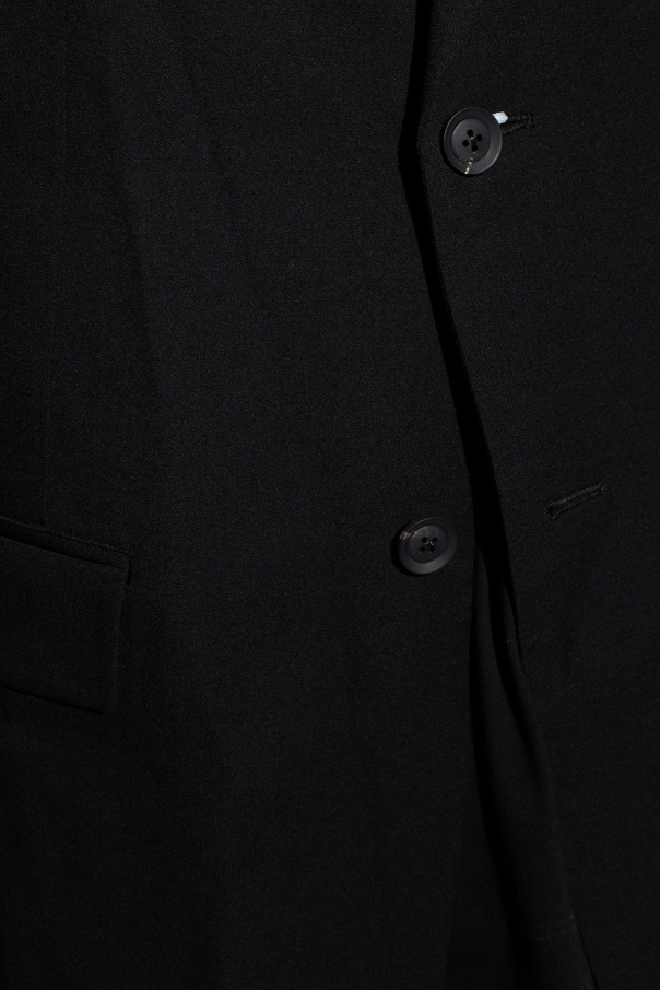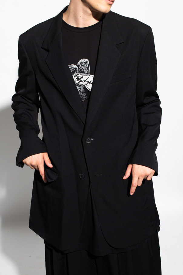 Black blazer from Yohji Yamamoto. Crafted from wool with an elongated silhouette, this style features button fastenings, notch lapels, two flapped pockets, one slip pocket and long sleeves.