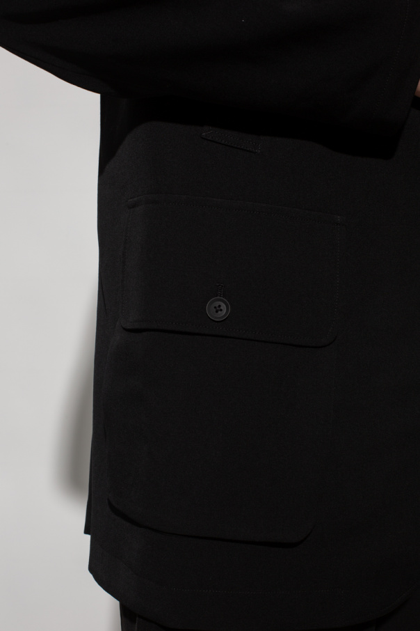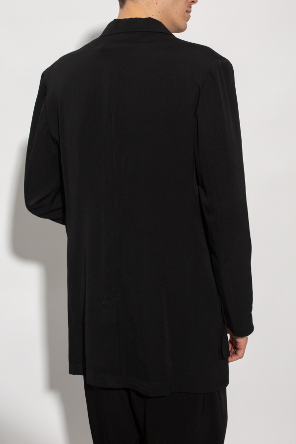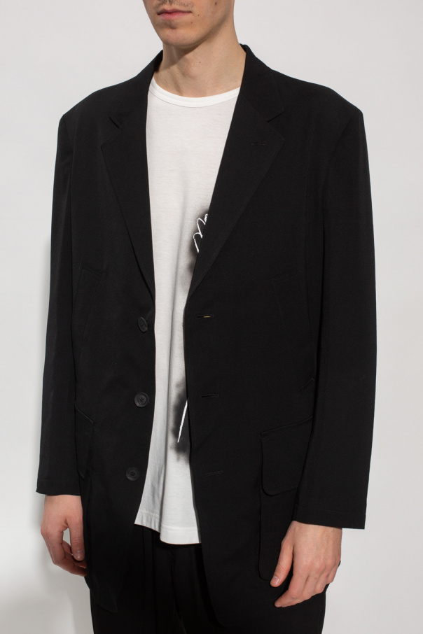 Black blazer from Yohji Yamamoto. Made of wool, this long sleeve design features button fastenings, notch lapels, two slip pockets, two button pockets and a single rear vent.