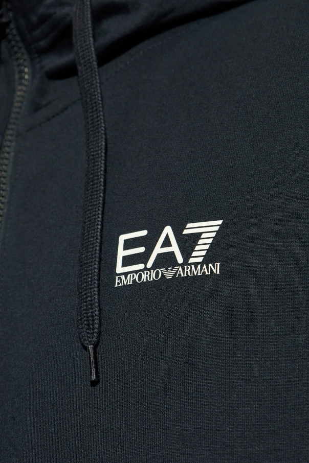 Introducing the epitome of luxury casual wear—the EA7 Emporio Armani Navy Hooded Zip-Up Sweatshirt. Crafted with unparalleled attention to detail, this garment is a testament to the sophisticated style and innovative design characteristic of the esteemed EA7 Emporio Armani collection. The sweatshirt's fabric is a smooth, high-quality cotton, showcasing a rich navy hue that exudes elegance and versatility. The classic, streamlined silhouette is complemented by long sleeves with elastic cuffs and a hem, ensuring a comfortable fit that is both functional and stylish. Subtle yet distinct, the white "EA7" inscription alongside the designer's logo on the left chest area accentuates the sweatshirt's exclusive appeal. Further enhancing its unique design is a small, white, vertical graphic stripe on the lower back, a signature touch from the designer. Practicality meets sophistication with its dual-direction zip fastening, which allows for effortless wearability and temperature control. The adjustable drawstring hood caters to personal comfort, making this sweatshirt not only a statement piece but also a versatile addition to any discerning gentleman's wardrobe. Why purchase this product? Exquisite craftsmanship from the renowned EA7 Emporio Armani collection. Luxurious 100% cotton material, offering both comfort and durability. Exclusive design details, including the iconic logo and unique graphic elements. Adjustable features and zip-up convenience for a personalized fit. Timeless navy color, easy to integrate into any sophisticated attire.