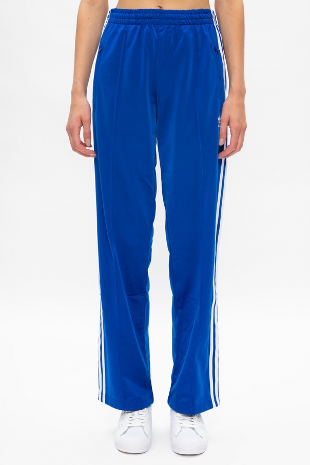 Navy blue track pants from Adidas Originals. Sporting white trefoil logo embroidery and signature three stripes down the sides, this pair falls down with straight legs and features an elasticated waistband with a drawstring fastening, two zipped pockets, distinctive stitching details and zipped outseams.
