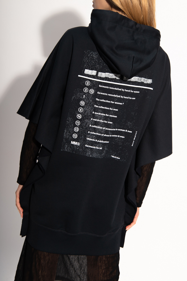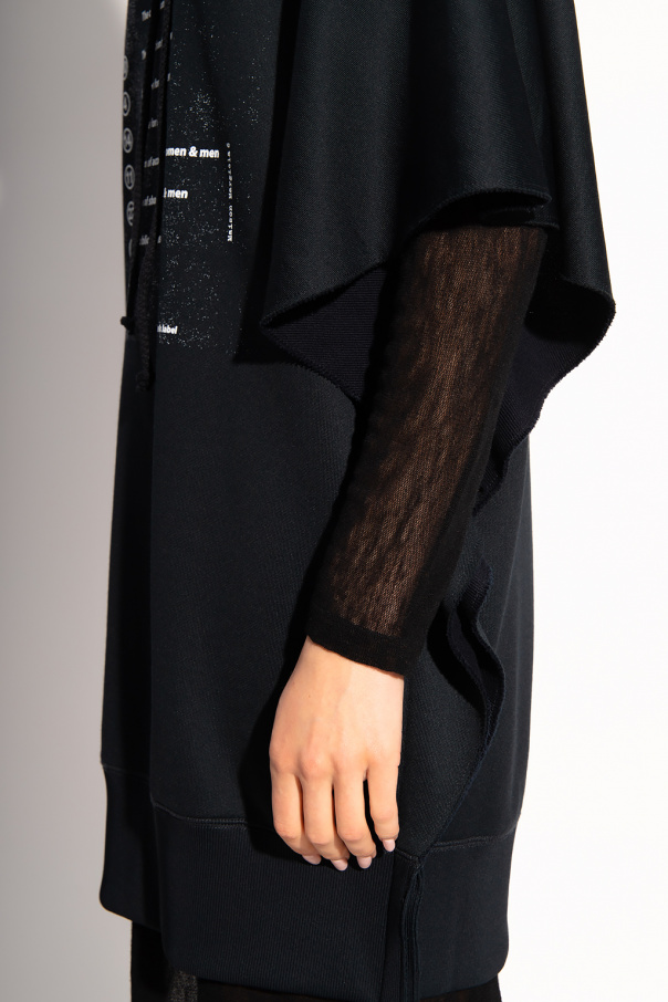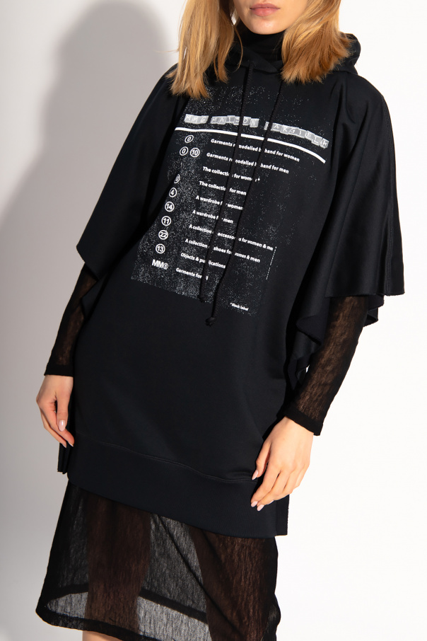 Dark green dress with a drawcord-adjustable hood from MM6 Maison Margiela. Crafted from cotton jersey with an oversize silhouette, this style features a white and grey graphic print with the brand's logo and an elasticated bottom hem.