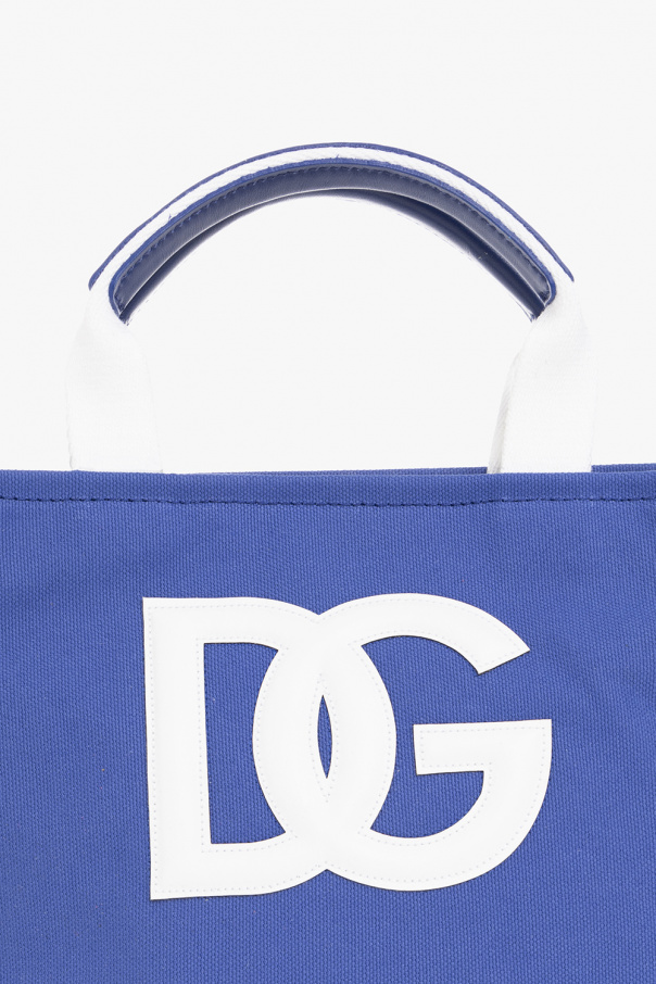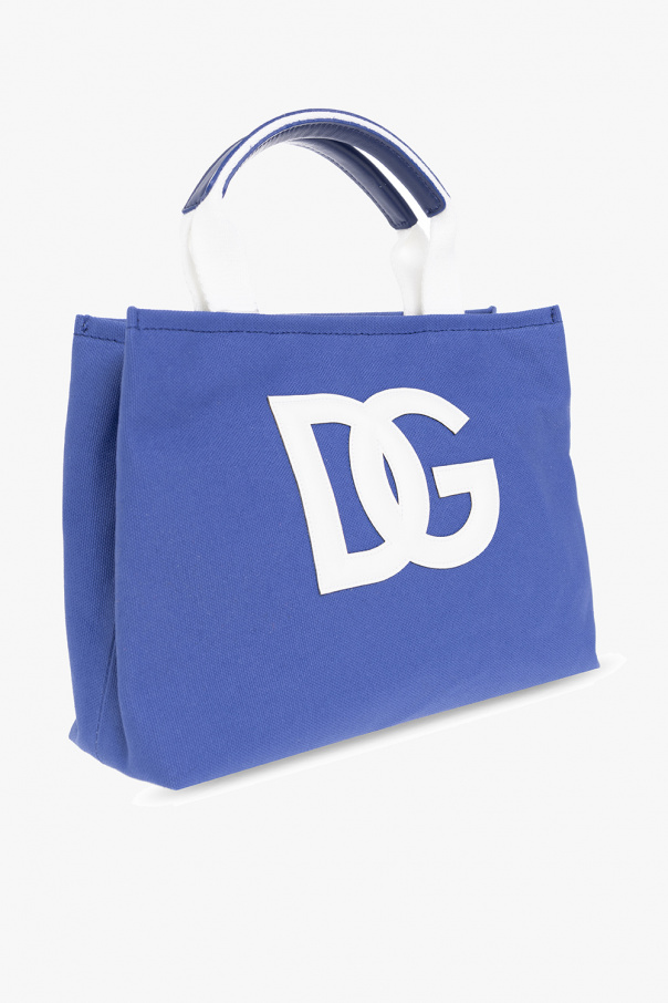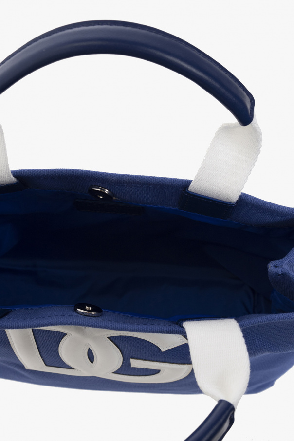Blue handbag from Dolce & Gabbana Kids. Crafted from cotton, this design is complete with a magnetic snap, white leather patch with a logo, two half-round handles, one internal compartment and silver-tone metal hardware.