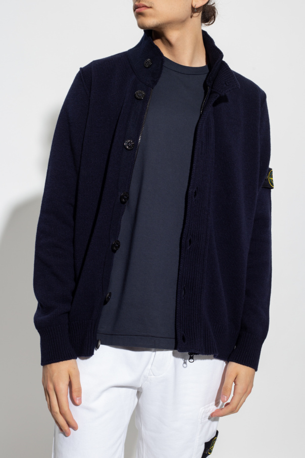 Navy blue cardigan from Stone Island. Emblazoned with a black, green and yellow logo patch, this wool-crafted style secures with a zip and buttons and features elasticized trims on the collar, bottom hem and cuffs.
