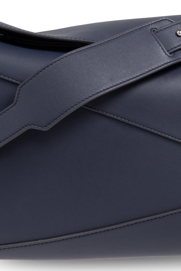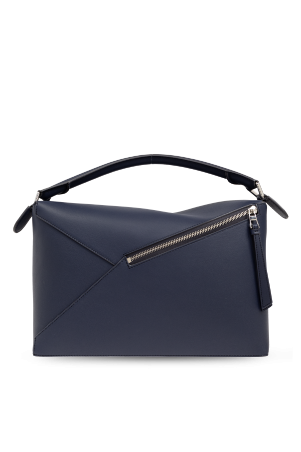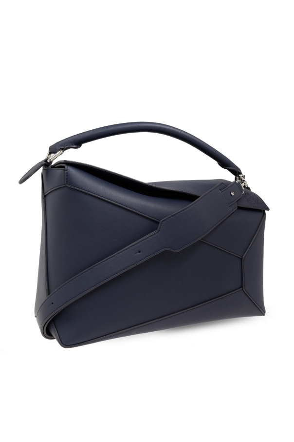 Introducing the exquisite Puzzle Large Shoulder Bag from Loewe's exclusive collection. This navy masterpiece showcases an asymmetrical, geometric design reminiscent of intricate puzzles, exuding modern sophistication. Crafted from premium leather, this shoulder bag promises unparalleled durability and luxury. The front flaunts distinct geometric stitching that enhances its unique aesthetic, while the back features a diagonal metal zipper, adding both practicality and elegance. Designed for versatility, the bag comes with a thick, adjustable shoulder strap ensuring comfort, and a sturdy hand-held grip for added convenience. Inside, the spacious compartment, secured with a zipper, includes two slip pockets, offering ample space and easy accessibility. Every detail is meticulously finished, reflecting superior craftsmanship. The subtle designer logo on the side is a testament to its prestige and authenticity. Why Choose This Product? Modern, geometric design High-quality leather for durability Spacious interior with practical compartments Adjustable strap for comfort Subtle designer branding