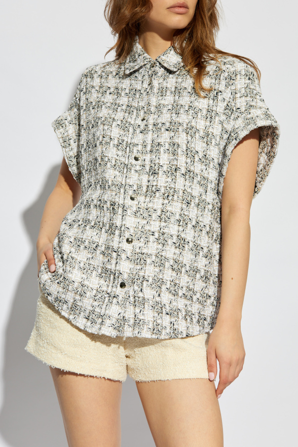 Introducing the 'Gaidan' tweed shirt by Iro, a paragon of elegance and sophistication. Crafted from a luxurious blend of materials, this shirt exudes a sense of refined durability. Its dominant grey hue, enriched with a mélange effect from interwoven light and dark threads, creates a visually captivating texture. The shirt's design features short sleeves and a classic collar, lending it a formal yet versatile appeal. The presence of distinctive metal buttons accentuates its exclusive look, each round button showcasing the meticulous craftsmanship involved in its creation. The tweed fabric, known for its resilience and rich texture, ensures that this piece not only stands the test of time but also elevates any ensemble. Its straight silhouette promises ease of movement, making it an ideal choice for those who value both style and comfort. The 'Gaidan' maintains its sleek appearance from front to back, with a smooth, consistent style that speaks to its high-quality construction. Why Purchase This Product? Exquisite Material Blend: Made from cotton, polyester, acrylic, and polyamide, offering durability and comfort. Luxurious Design Details: Metal buttons and a rich tweed pattern set this shirt apart. Versatile Elegance: Suitable for formal and casual settings alike, thanks to its classic cut and sophisticated appearance. Exceptional Craftsmanship: A testament to the artisanal quality of Iro's designs, ensuring longevity and timeless style.