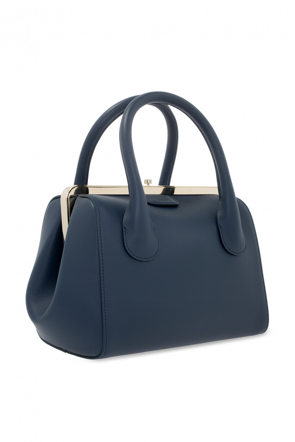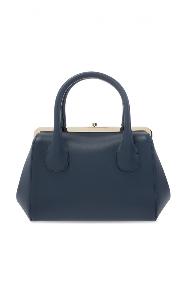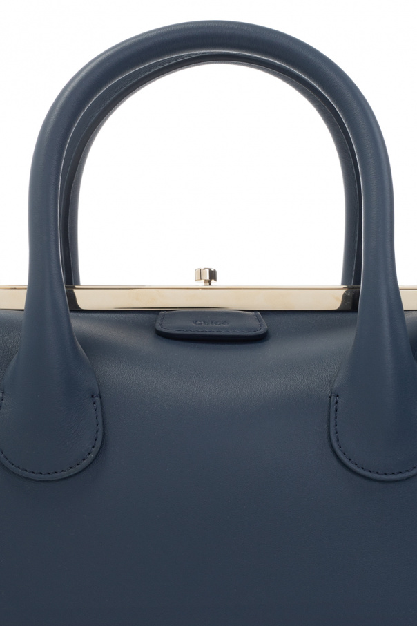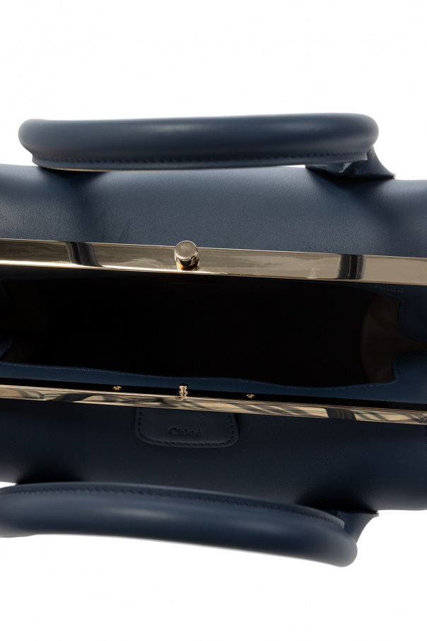 Navy blue ‘Joyce Medium’ handbag from Chloé. Crafted from calf leather, this design showcases a snap fastening, an embossed logo on the front, two half-round handles, gold-tone metal hardware and one internal compartment with a slip pocket.
