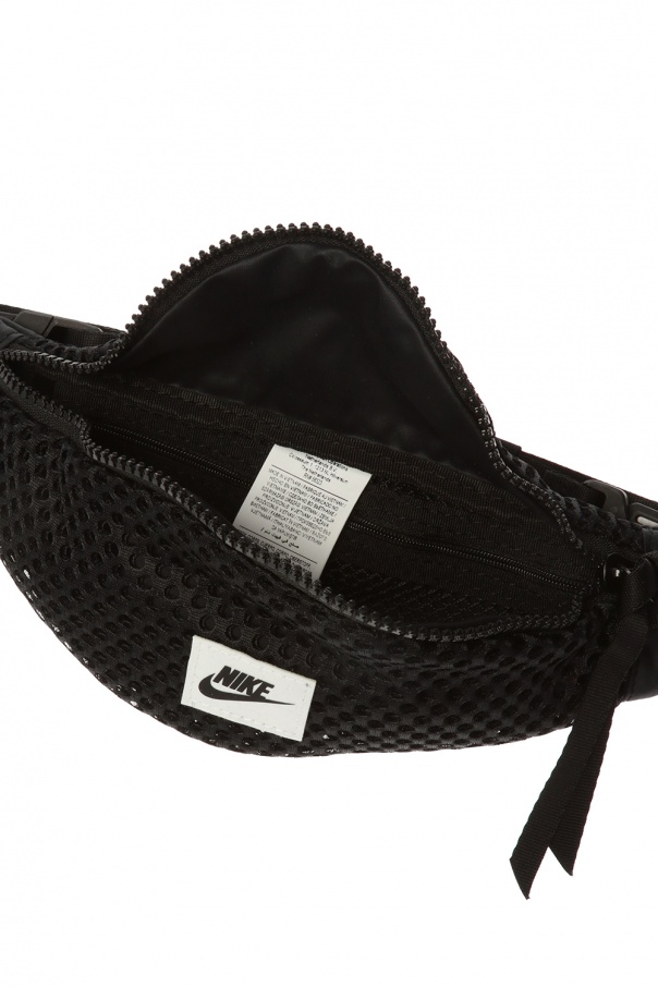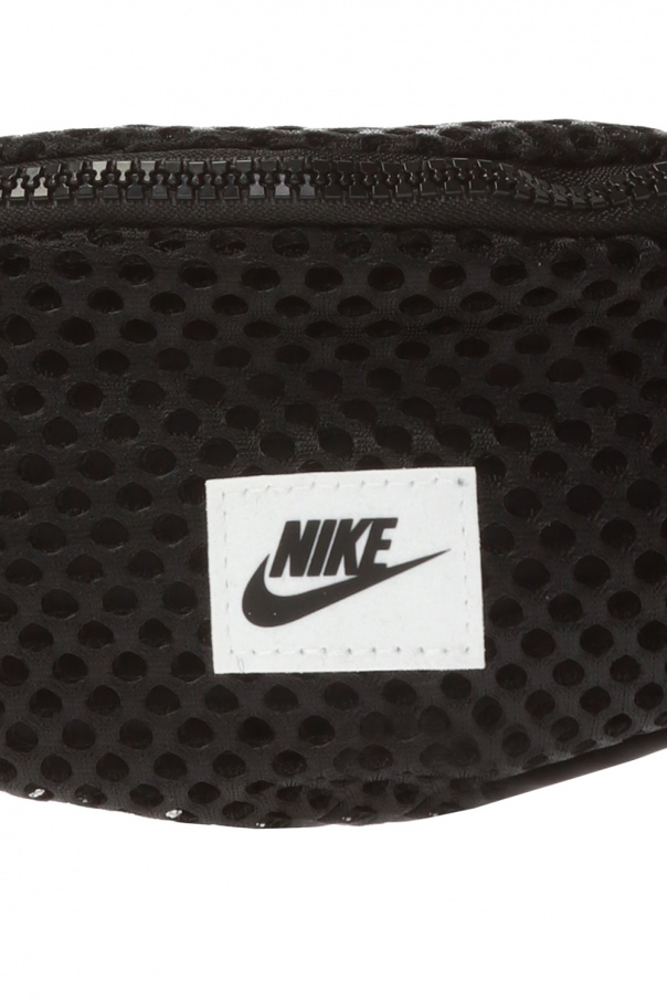 Black belt bag from Nike. With mesh construction, this design was emblazoned with a white and black logo patch and outfitted with an adjustable strap with buckle and interior with one compartment and one zip pocket.