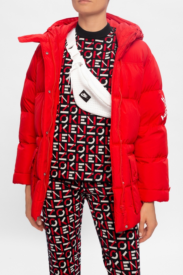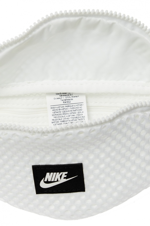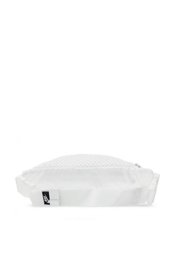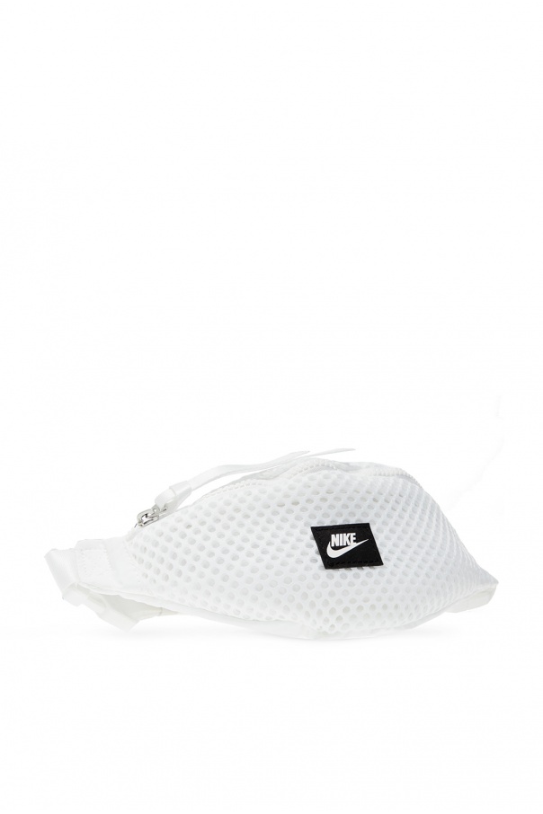 White belt bag from Nike. With mesh construction, this design was emblazoned with a white and black logo patch and outfitted with an adjustable strap with buckle and interior with one compartment and one zip pocket.